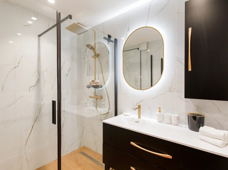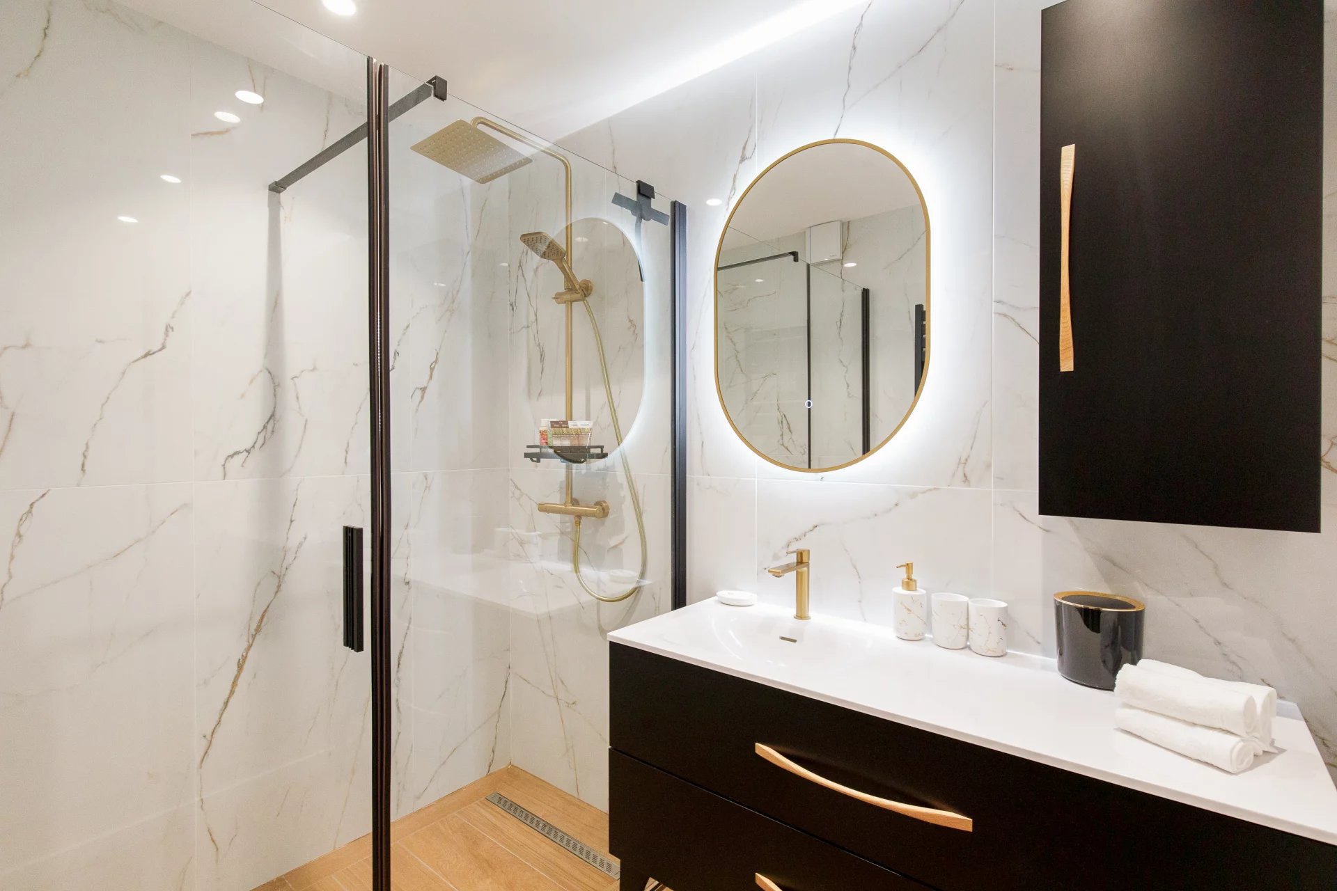 La cuisine contemporaine, entièrement équipée avec des matériaux et appareils de prestige, est idéale pour les amateurs de gastronomie. La salle de douche élégante, avec sa grande douche à l’italienne, et les WC séparés ajoutent une touche de fonctionnalité luxueuse à cet espace.