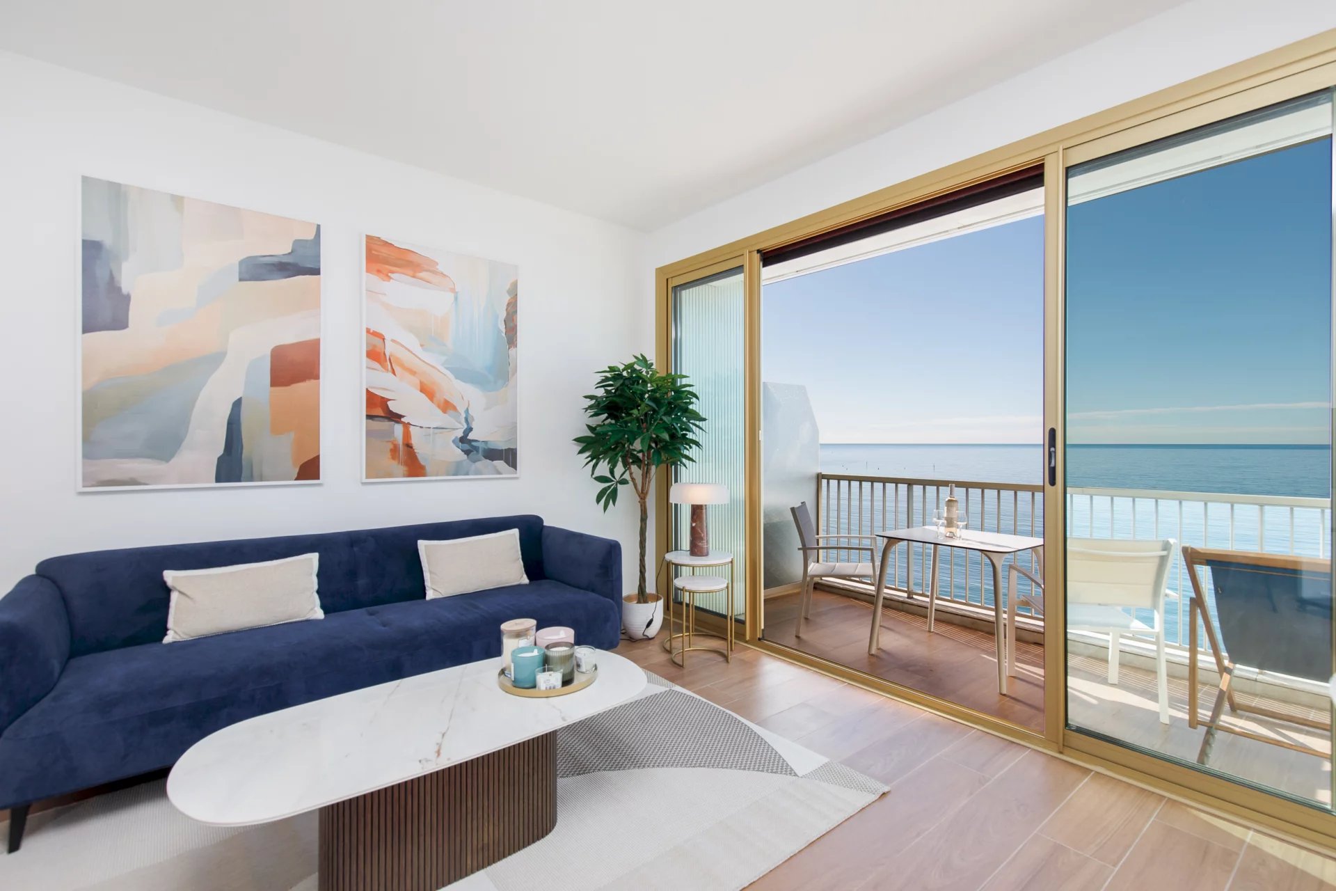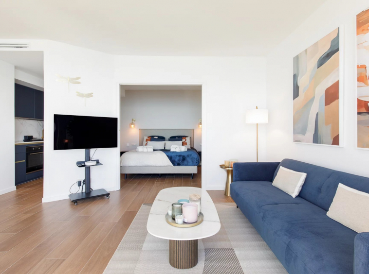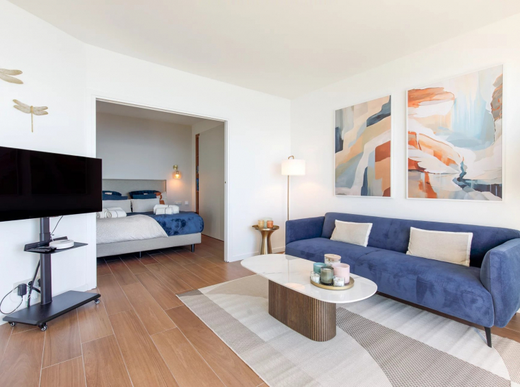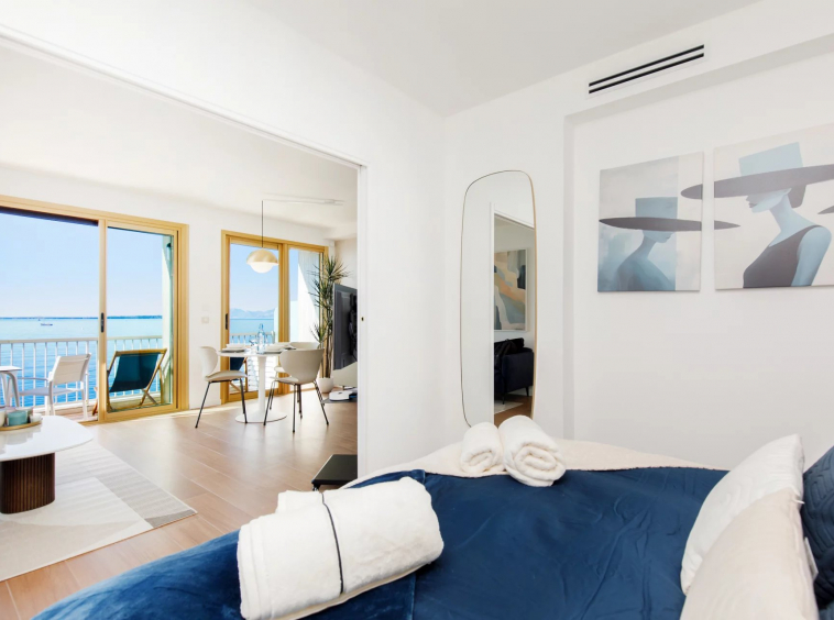 Baigné de lumière, cet appartement d’exception dispose d’une somptueuse pièce de vie ouvrant sur une terrasse offrant une vue imprenable et spectaculaire sur la mer Méditerranée. La chambre, équipée d’un lit king-size, invite à des nuits paisibles dans un écrin de sérénité face au bleu azur.