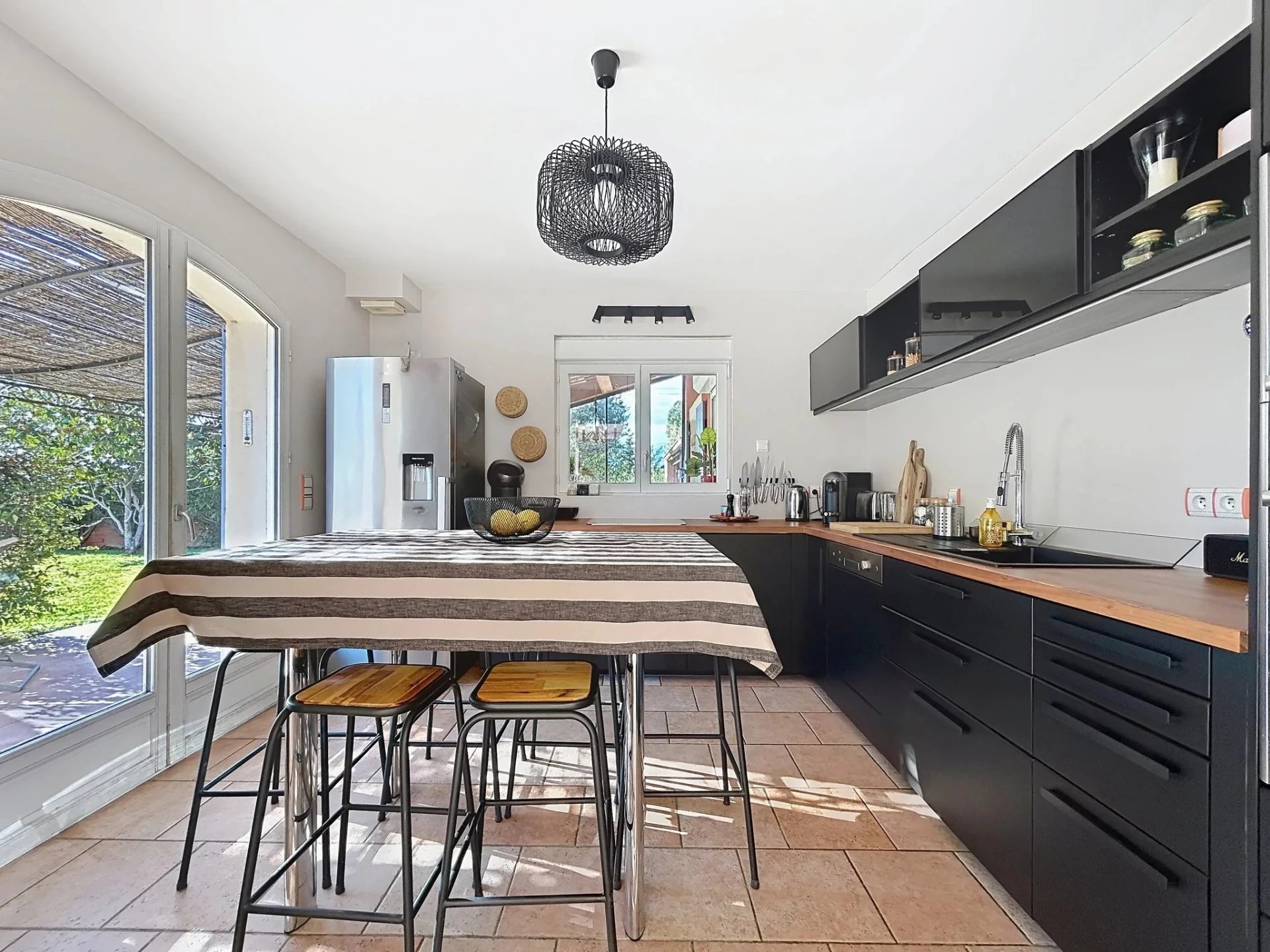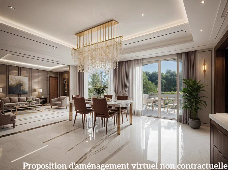 Le rez-de-jardin : Comprend deux chambres de plain-pied avec salles d’eau, un agréable salon avec cheminée, une salle à manger de 65 m², ouvrant sur une terrasse ensoleillée, et une cuisine semi-ouverte équipée.