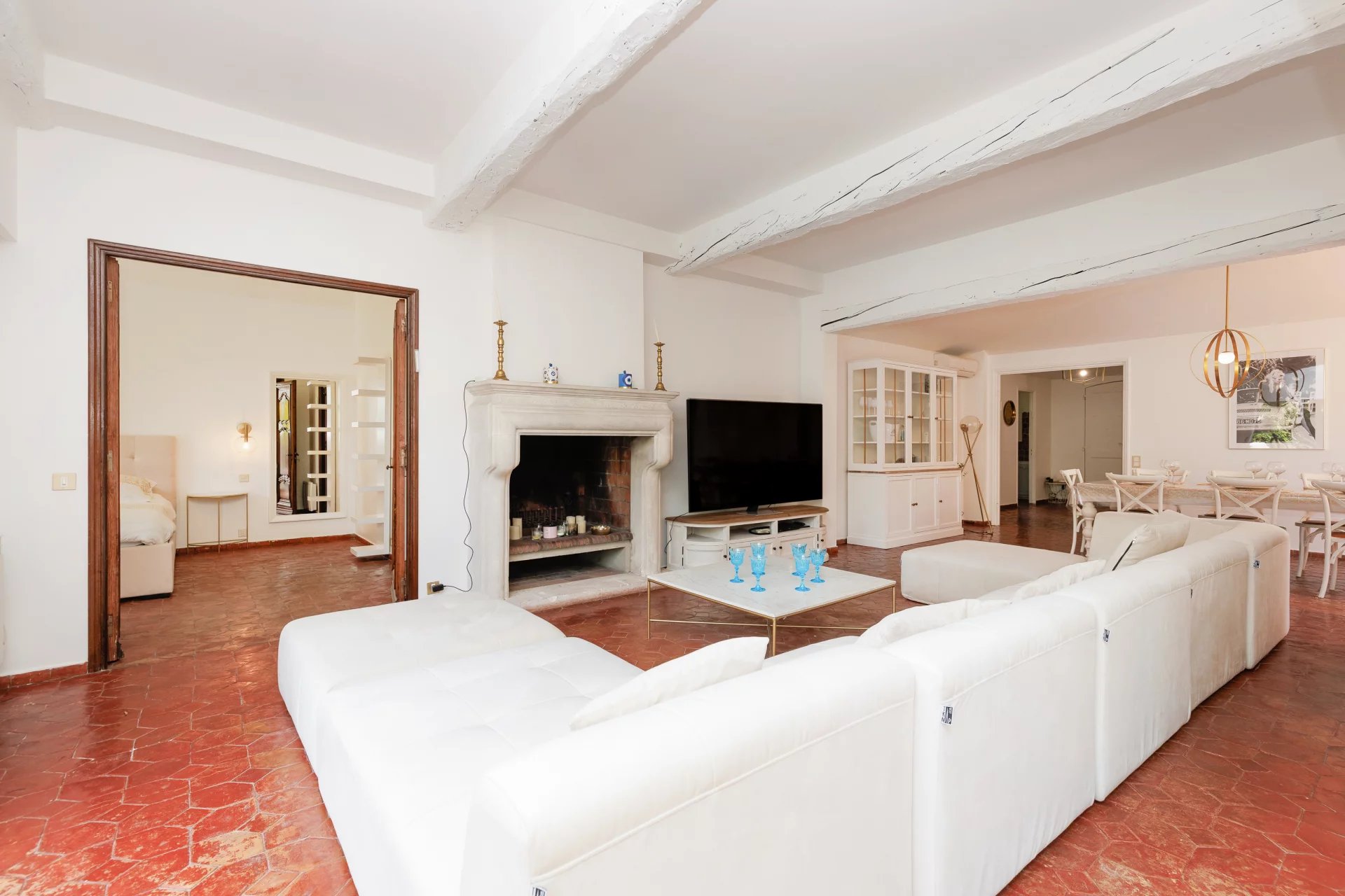 Le séjour, véritable cœur de la maison, est sublimé par une majestueuse cheminée en pierre qui invite à de douces soirées en famille ou entre amis.